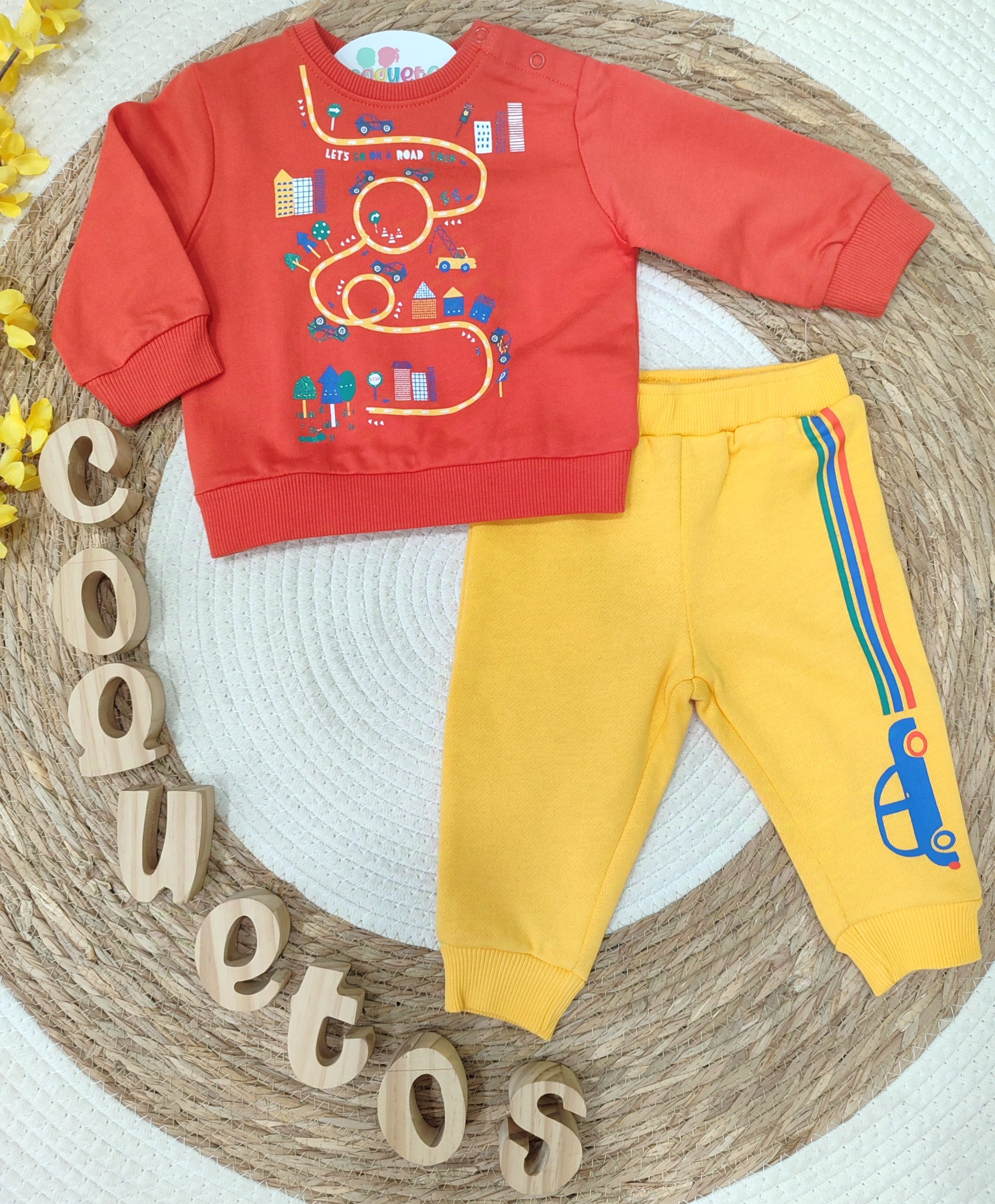 • Pantalón amarillo con detalle lateral de franjas de colores y coche azul estampado.