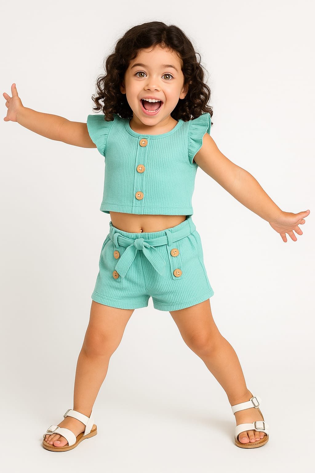- El top, de corte recto, destaca por sus encantadoras mangas con volantes que aportan un toque coqueto y femenino, y su cierre frontal con botones de madera que añade calidez y estilo natural al conjunto.