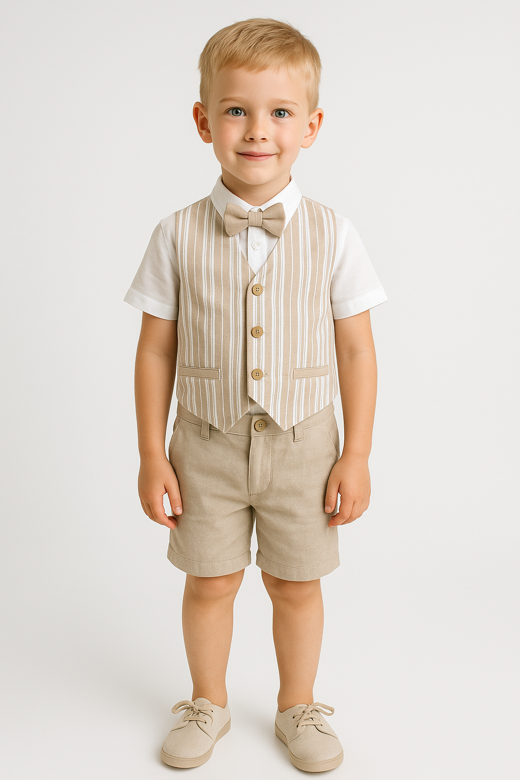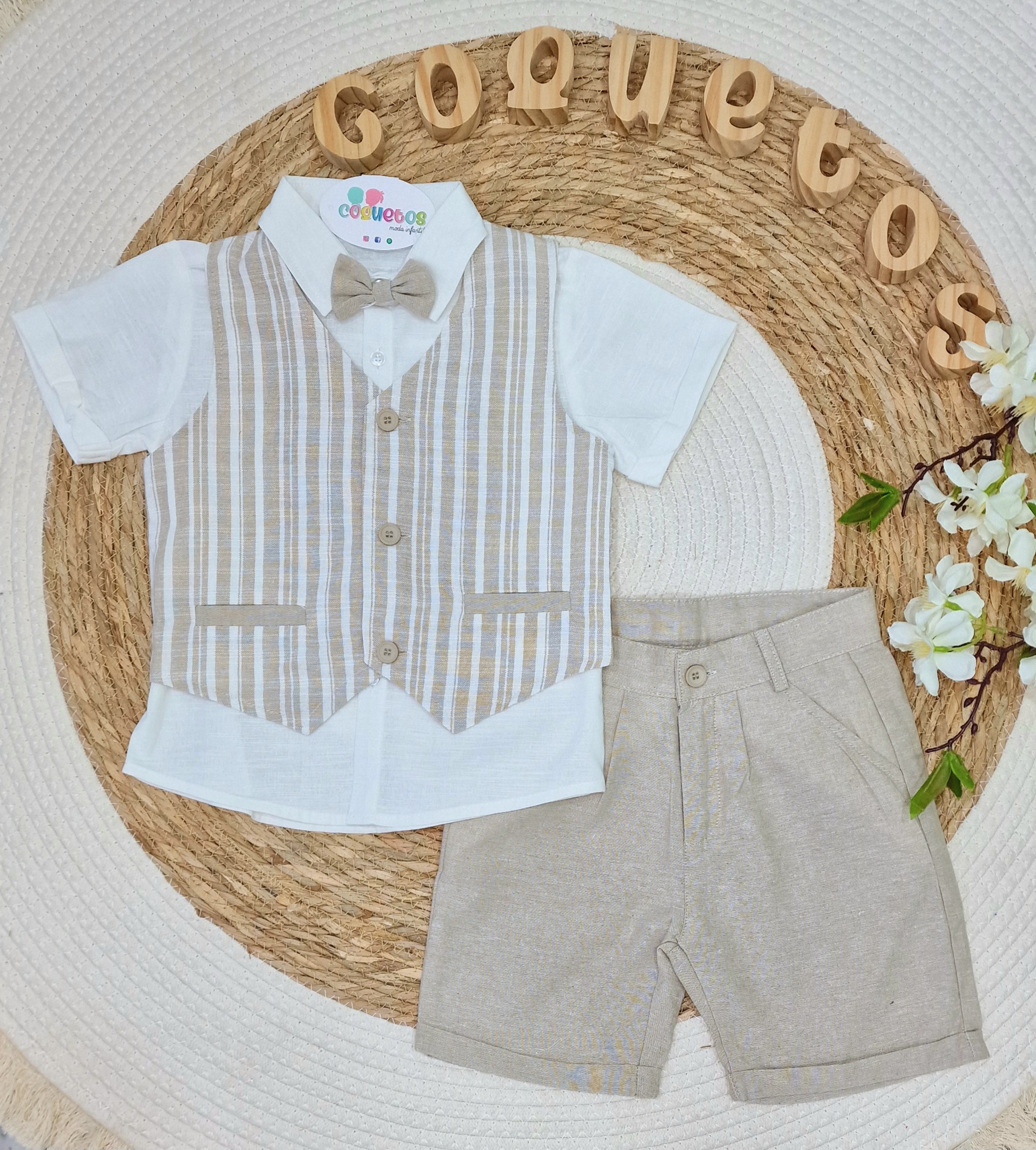• Incluye camisa blanca de manga corta con chaleco de rayas beige y crudo, adornado con botones de madera y pajarita a juego.