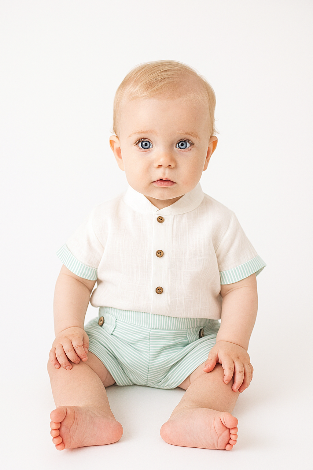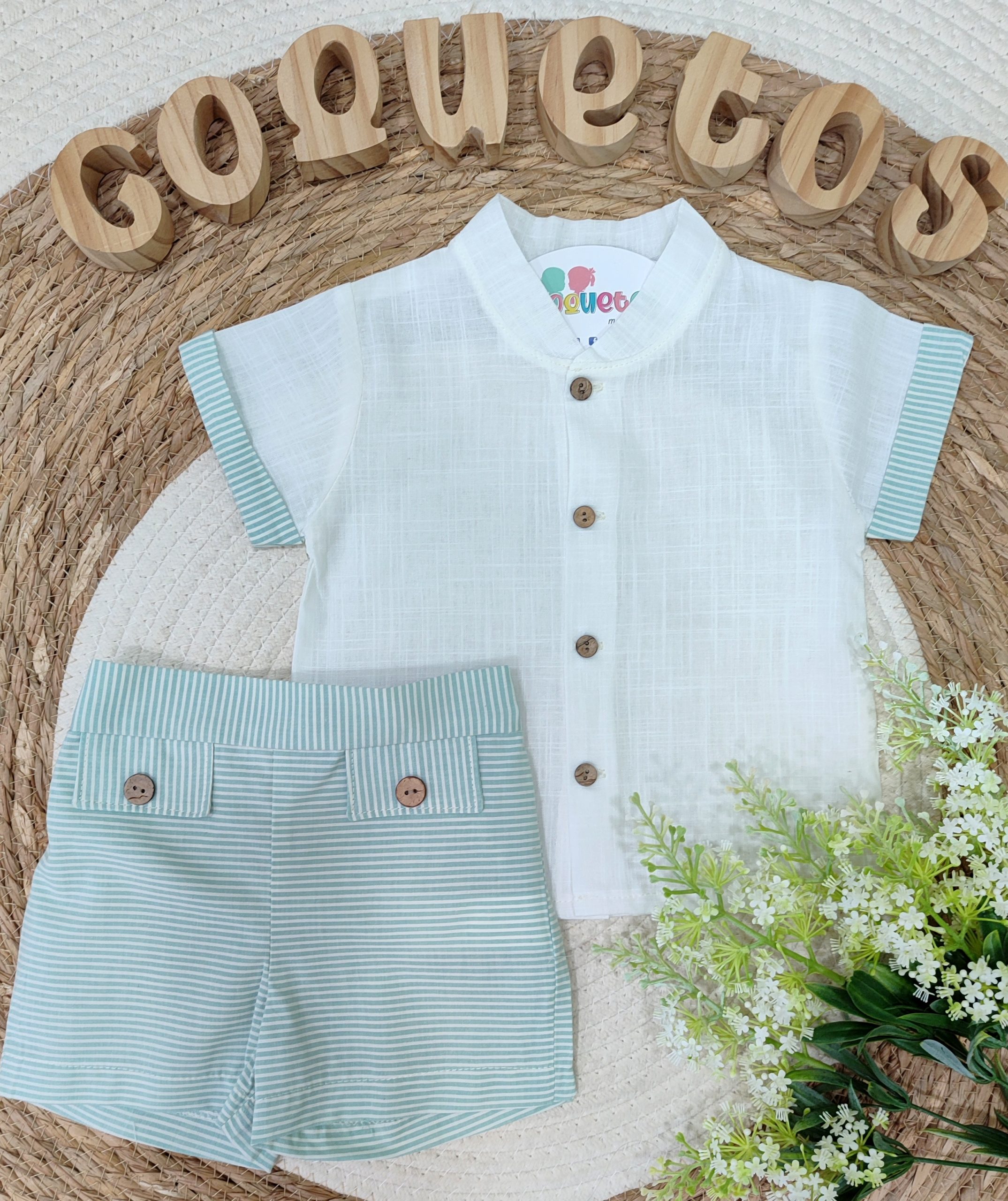 • Compuesto por una camisa de lino blanco con cuello mao y botones de madera, y un pantalón corto de rayitas verde agua con detalles a juego en los puños de las mangas, está pensado para ocasiones especiales y días soleados con estilo.