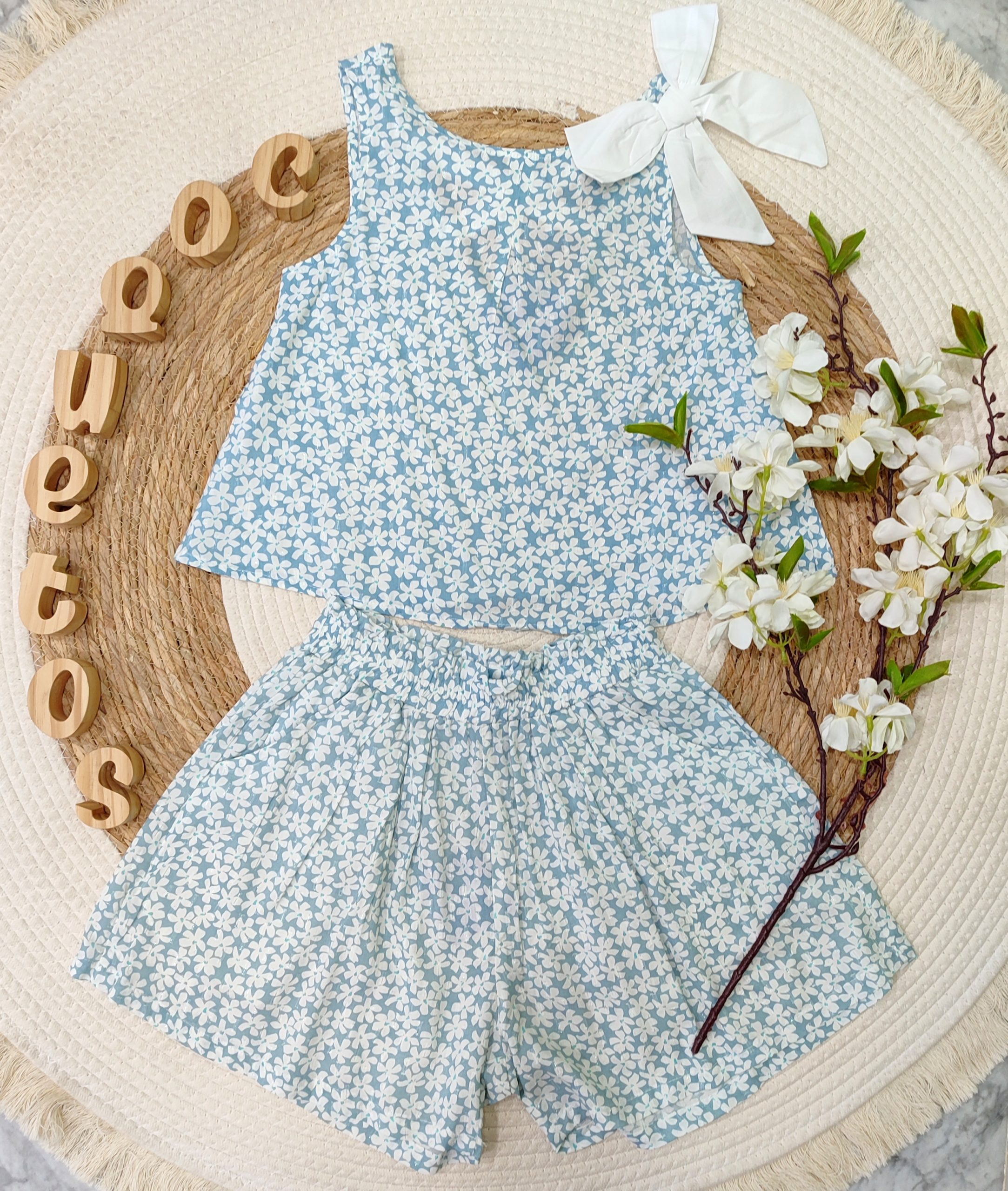 • El estampado floral en tonos blancos sobre fondo azul cielo transmite frescura y dulzura.