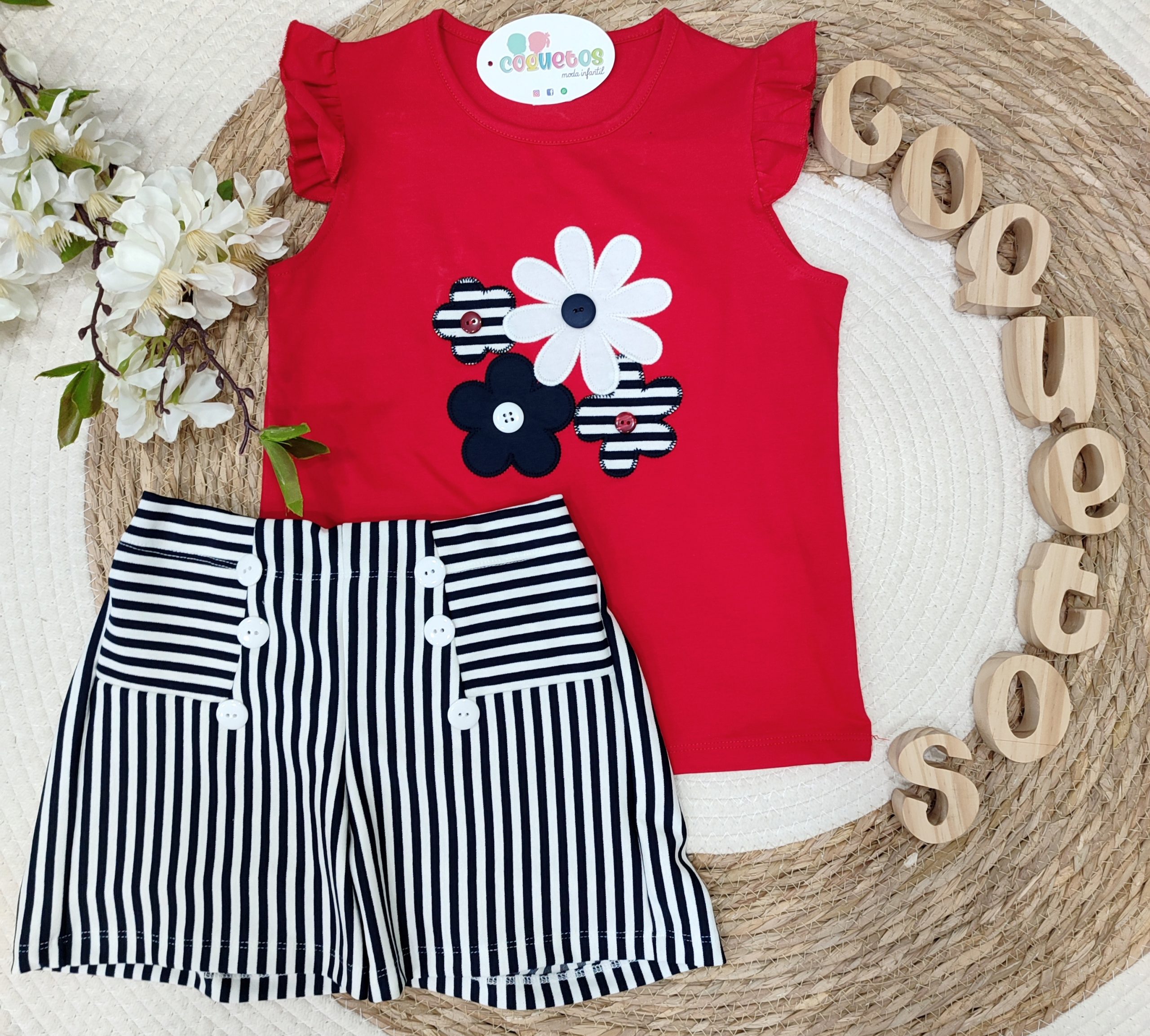 • La camiseta, en un vibrante tono rojo, destaca por sus apliques florales en tonos blanco, azul marino y rayas marineras, con botones decorativos que aportan un toque alegre y original.