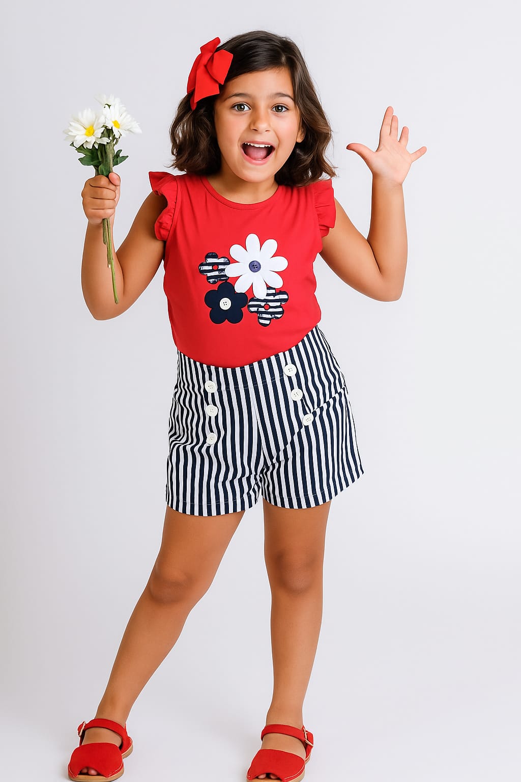 Conjunto infantil de verano compuesto por camiseta sin mangas de tirantes anchos con delicado volante en los hombros y short a rayas.