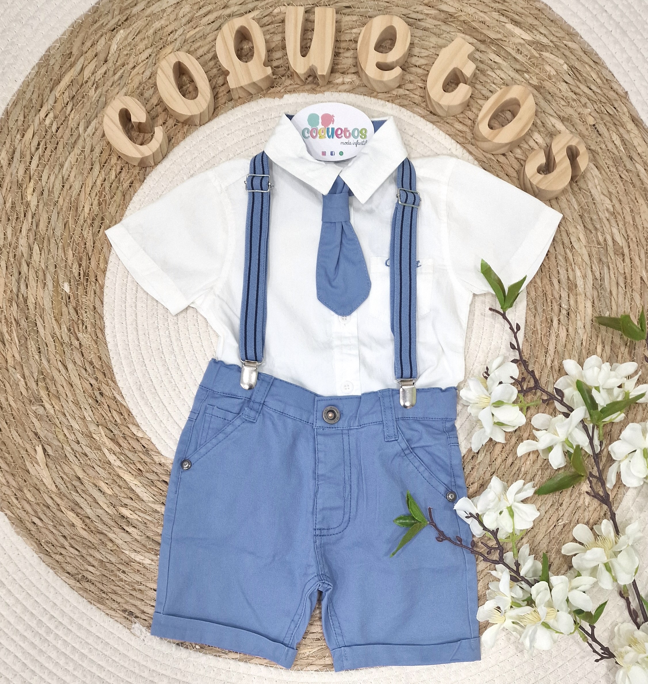 Conjunto ceremonia niño compuesto por camisa blanca de manga corta, tirantes a juego y pantalón corto tipo chino en un elegante tono azul empolvado.