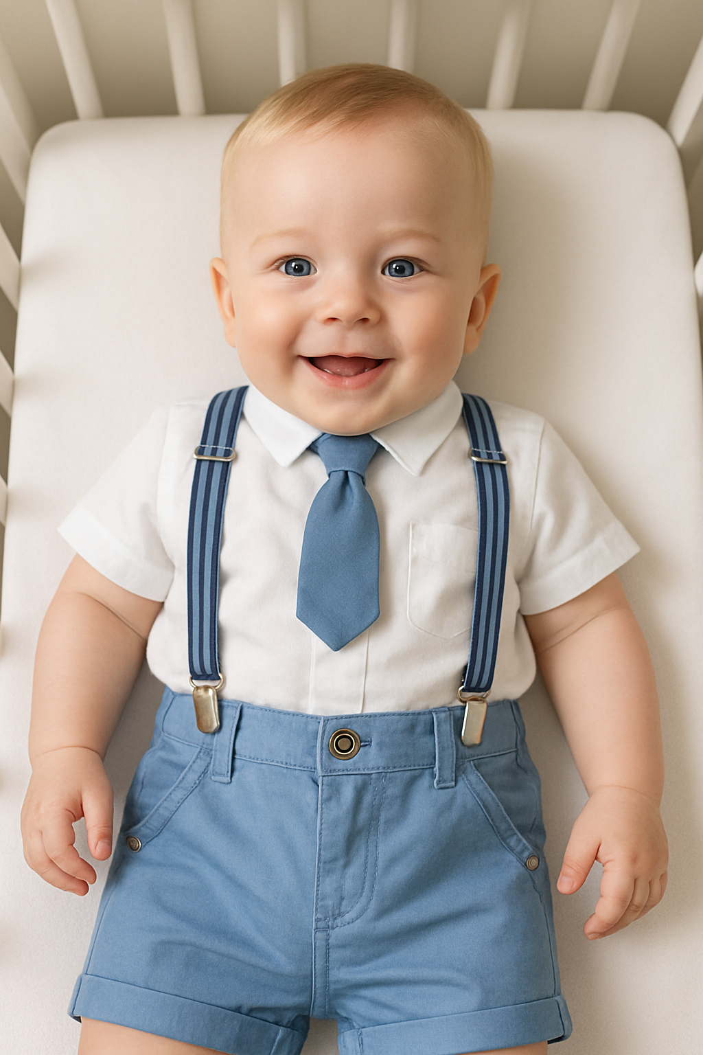 Este conjunto azul empolvado con tirantes y corbata es puro derroche de elegancia.