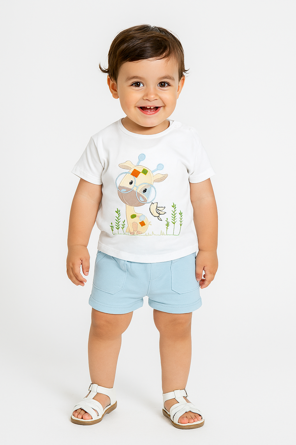 - Destaca por su divertido bordado de una jirafa con gafas y un pajarito, en tonos suaves y alegres que captan la atención sin recargar.