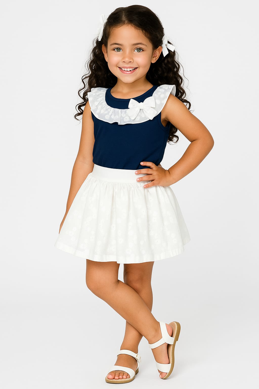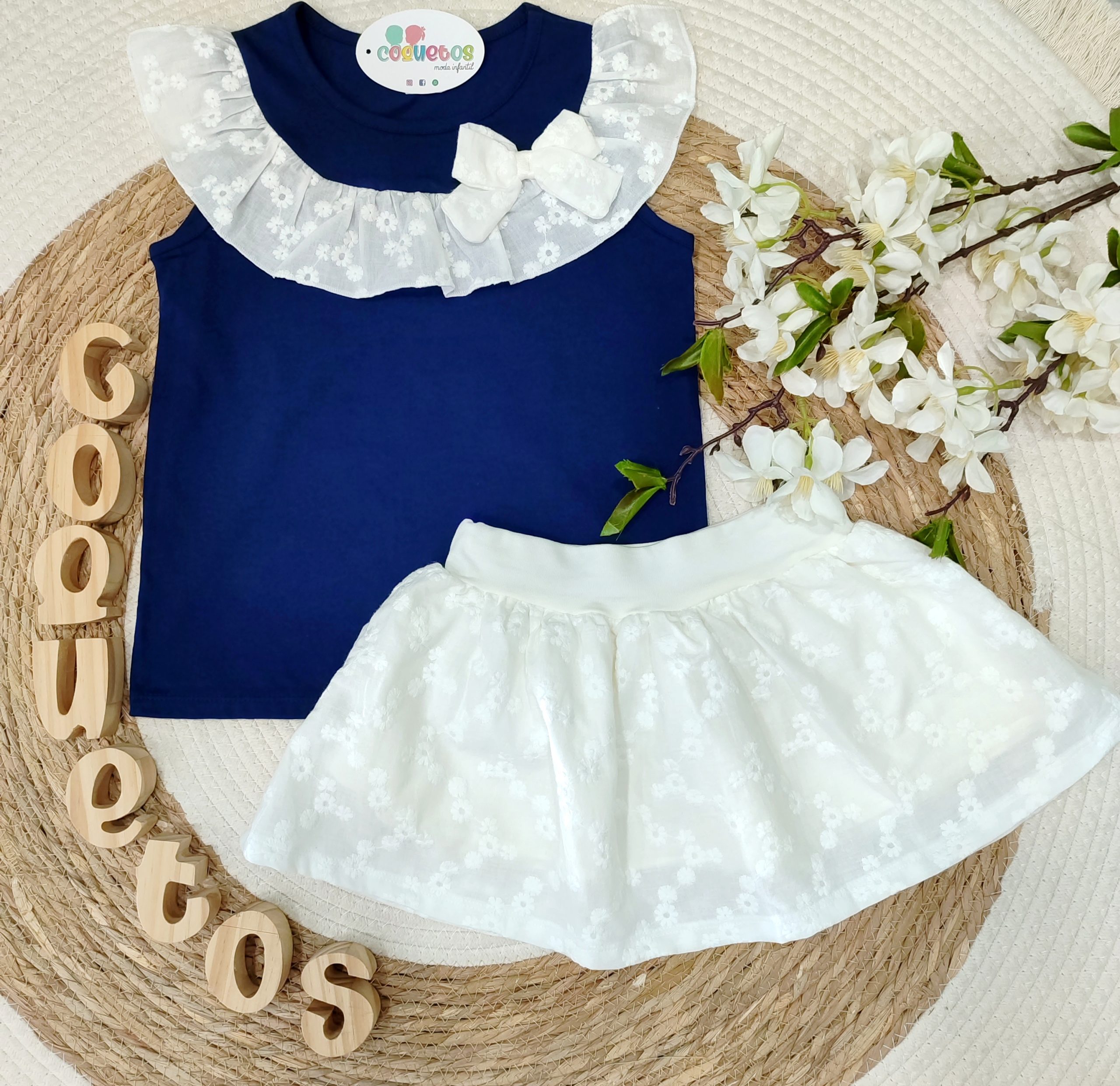 - La blusa sin mangas, en un elegante azul marino, destaca por su delicado volante blanco perforado con pequeños motivos florales, rematado con un lazo del mismo tejido, que aporta un toque dulce y encantador.