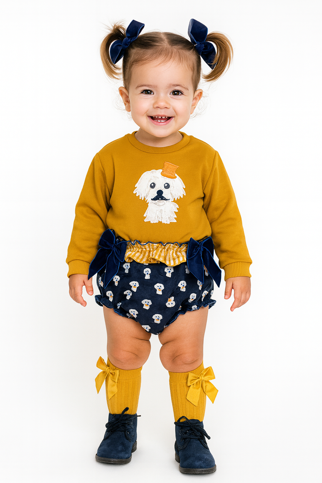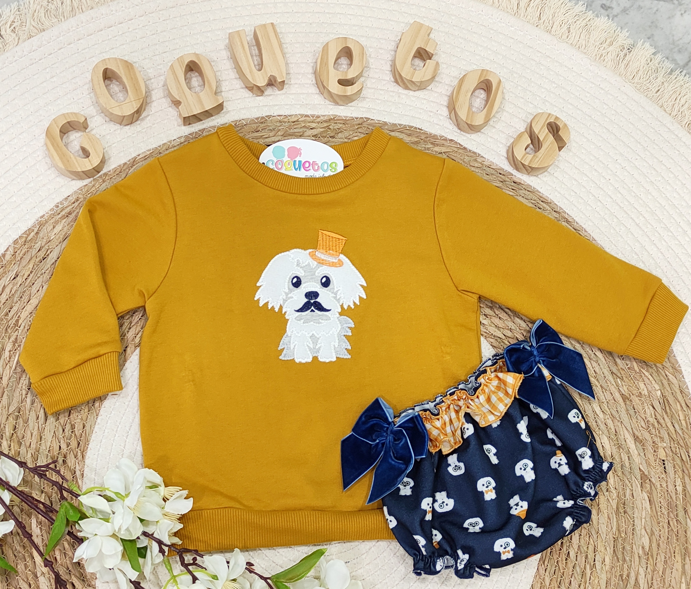 - Sudadera mostaza con adorable perrito bordado con bigote y detalle de sombrero naranja.