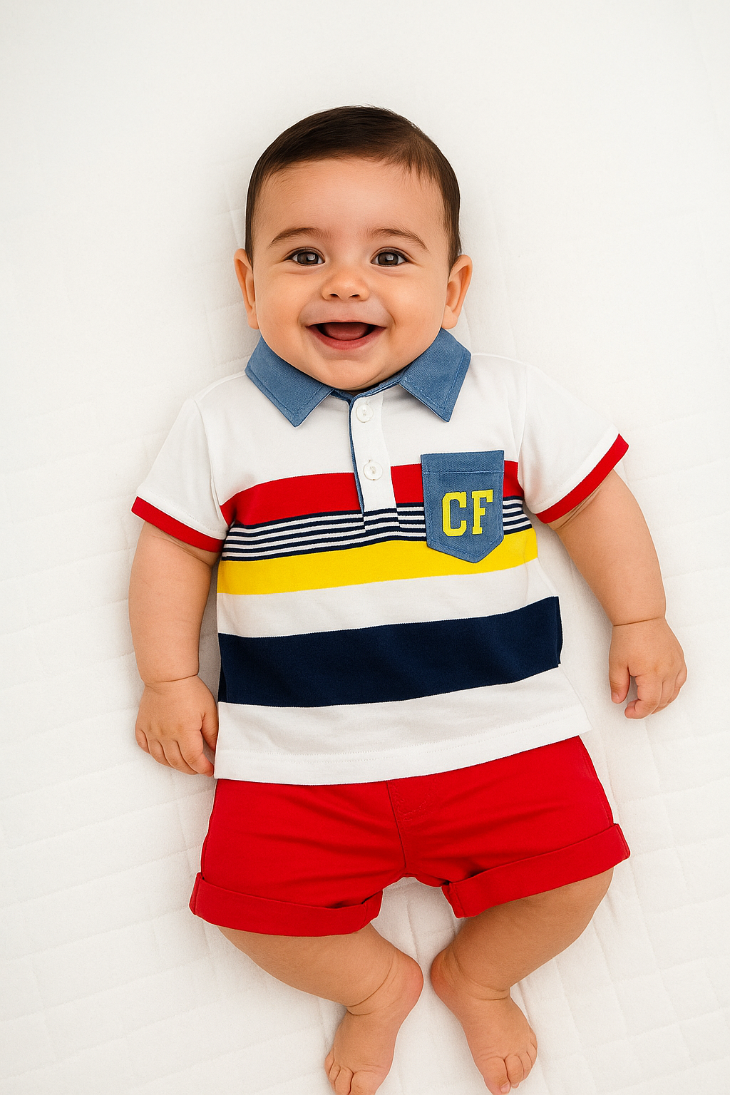 - La camiseta tipo polo presenta un diseño alegre con franjas horizontales en tonos blanco, rojo, amarillo y azul marino, rematada con un cuello camisero vaquero que aporta un toque elegante.
