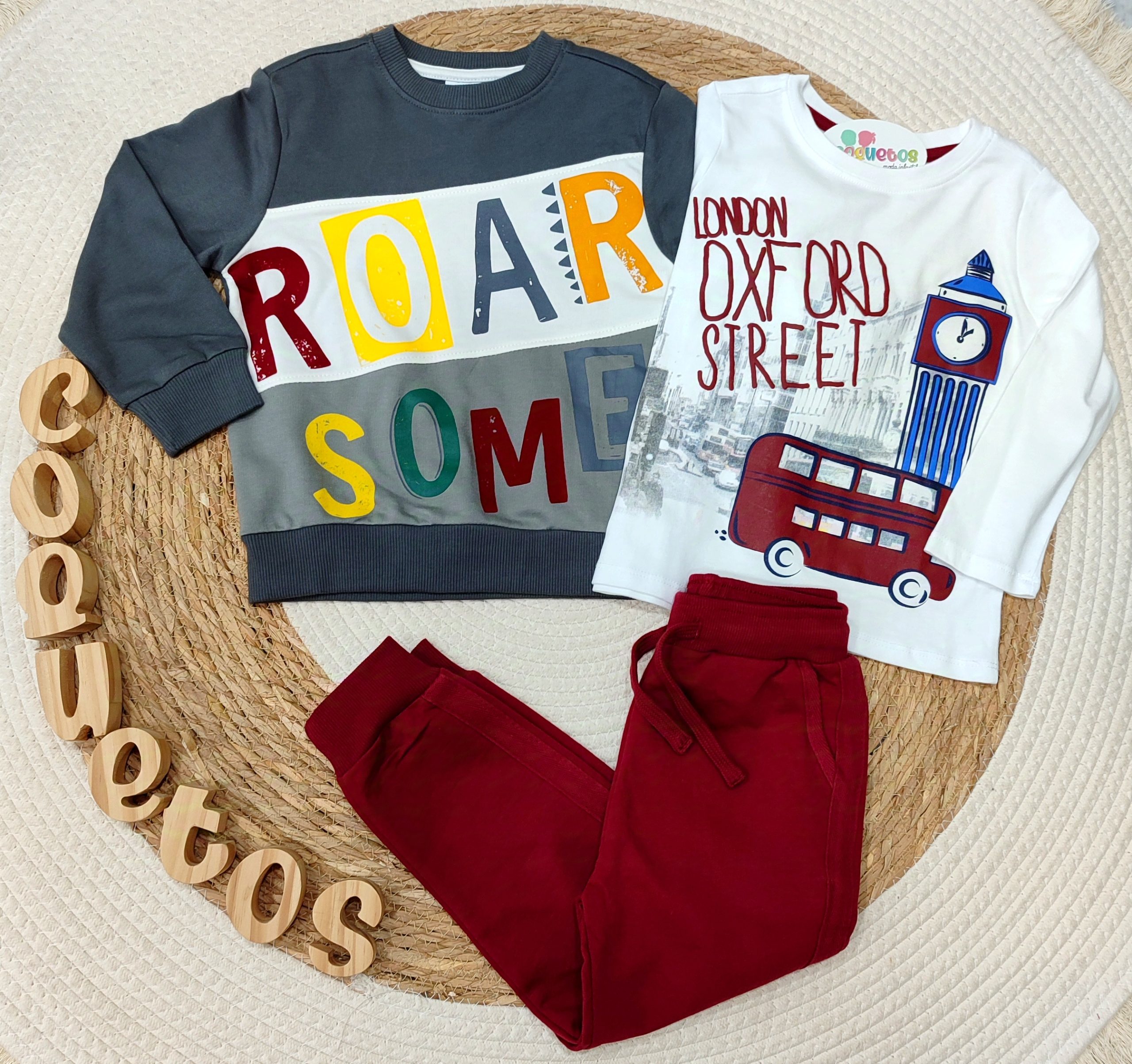 - Sudadera gris con letras de colores “ROAR SOME”, perfecta para combinar en los días frescos.