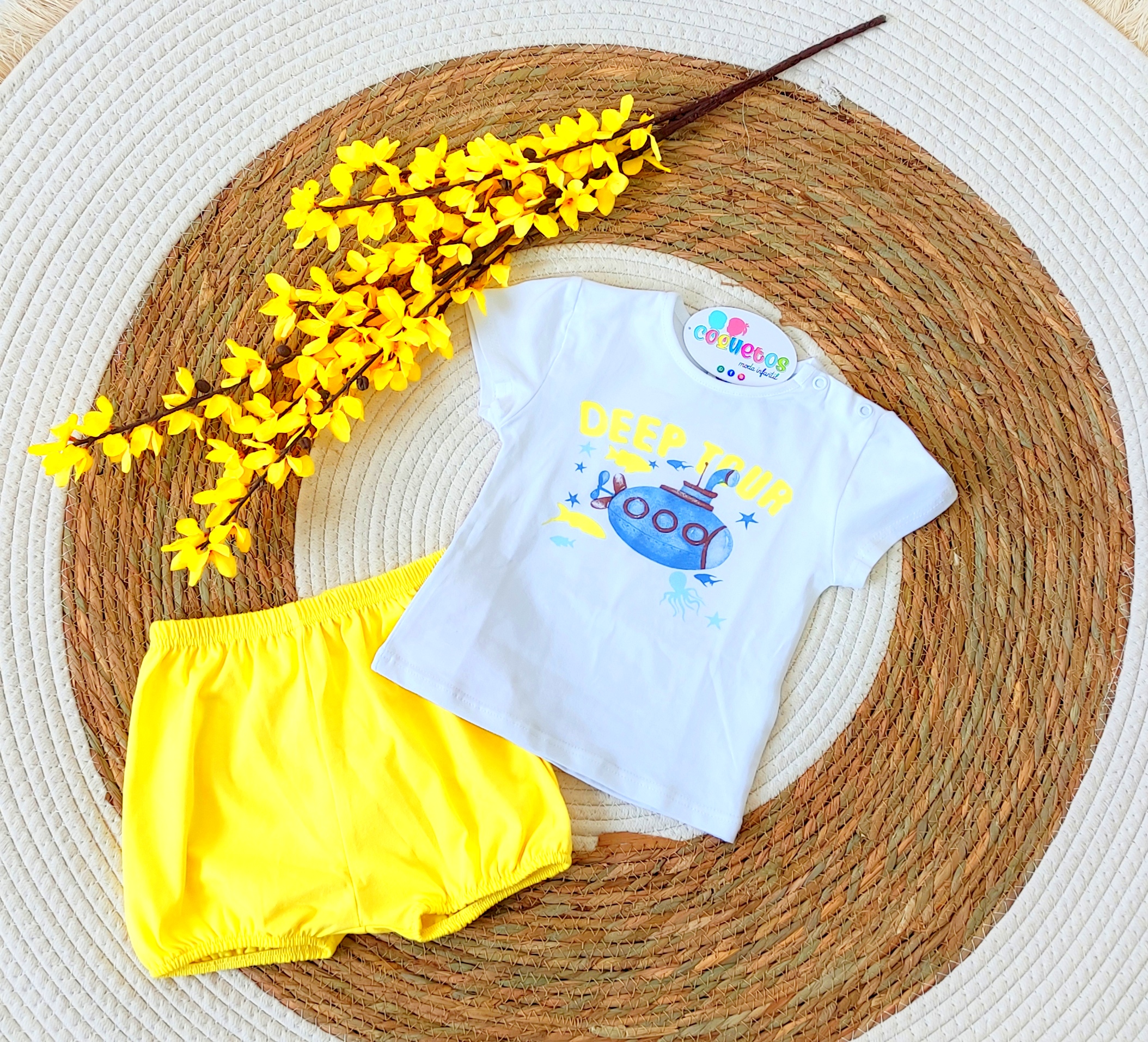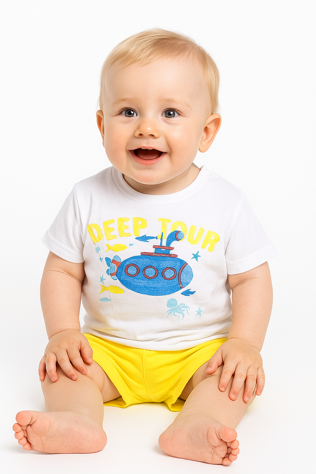- Compuesto por una camiseta blanca 100 % algodón con estampado submarino y mensaje «DEEP TOUR».