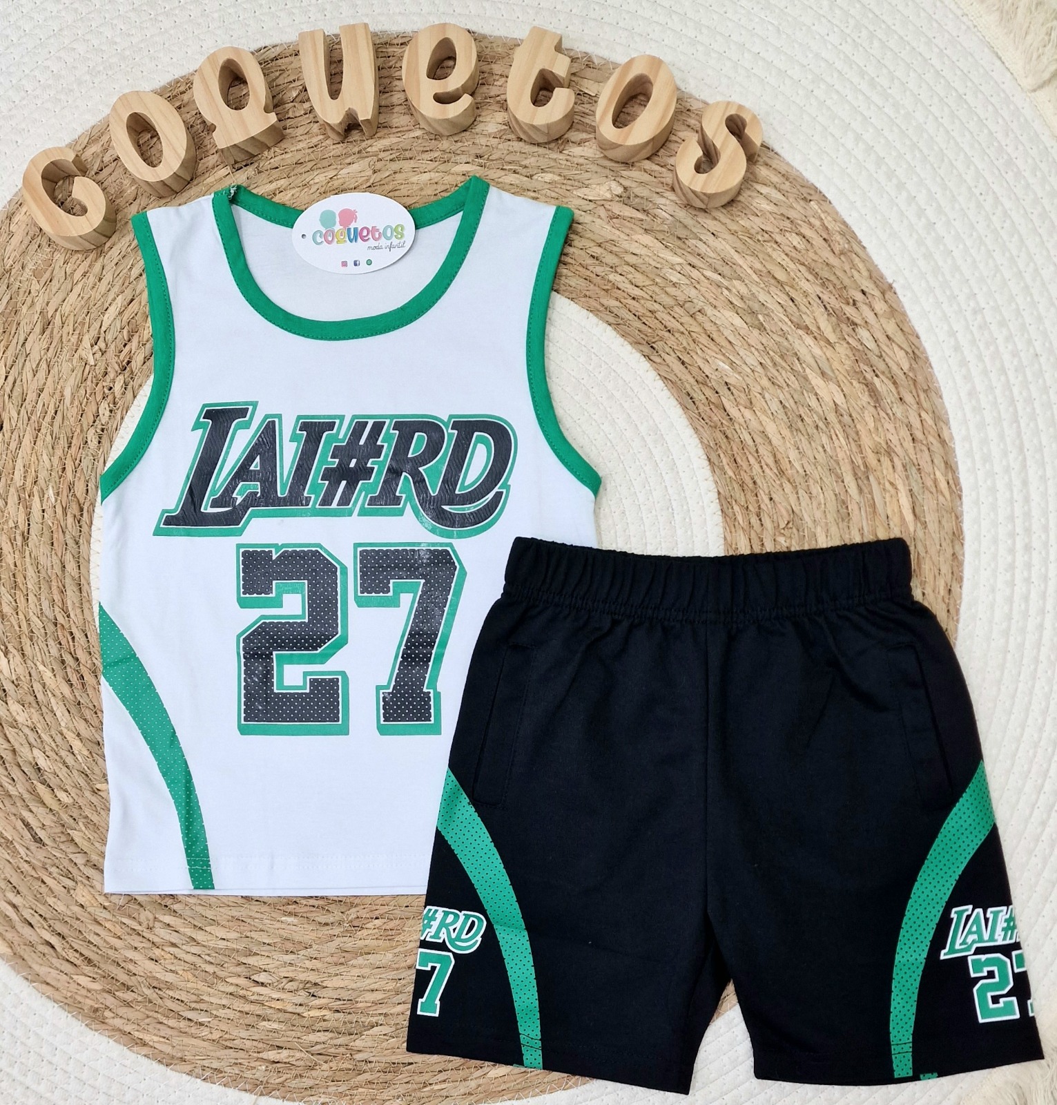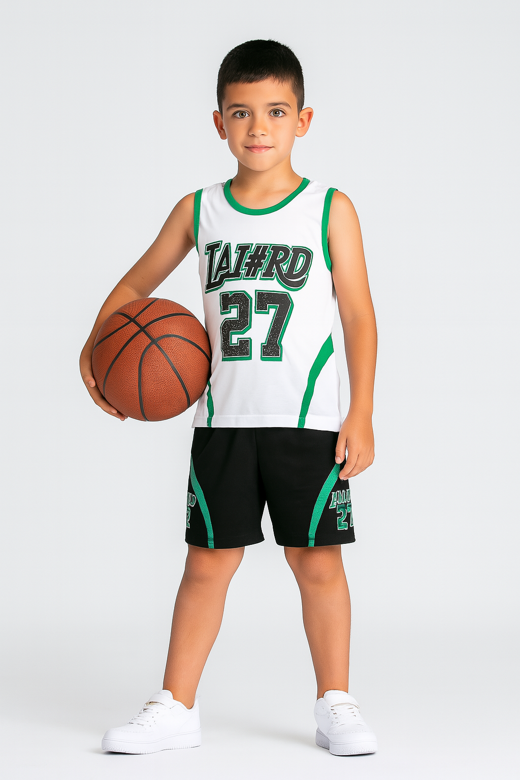 - La camiseta sin mangas, en color blanco con vivos verdes, luce un diseño moderno y enérgico con el número 27 y el texto «LAI#RD» en el pecho, aportando un aire urbano y deportivo.