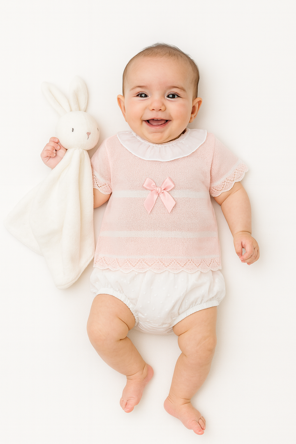 • La parte superior en color rosa pastel con detalles en blanco incluye un delicado cuello con volante de plumeti y un lazo de raso en el centro, aportando un toque de dulzura.