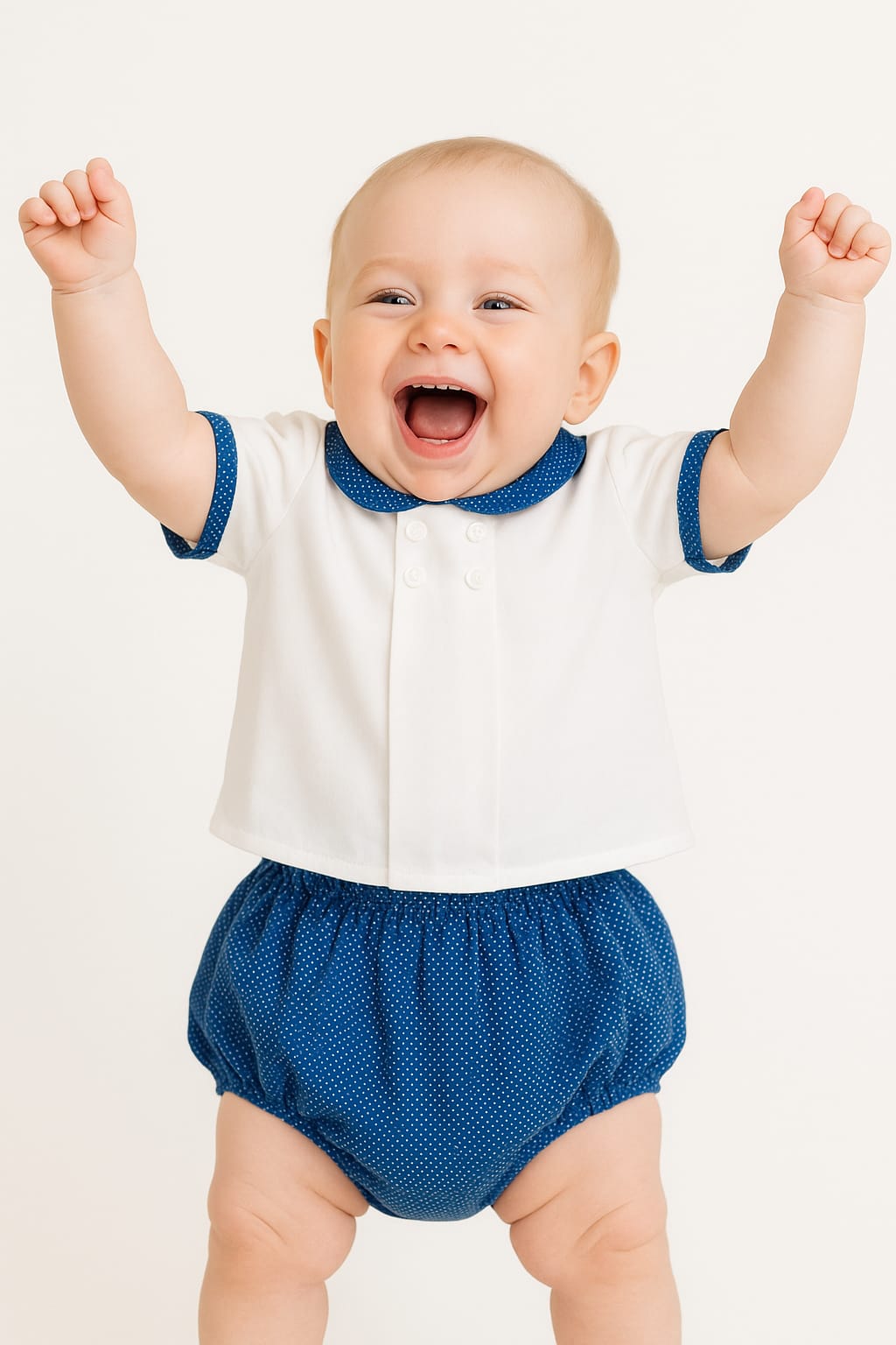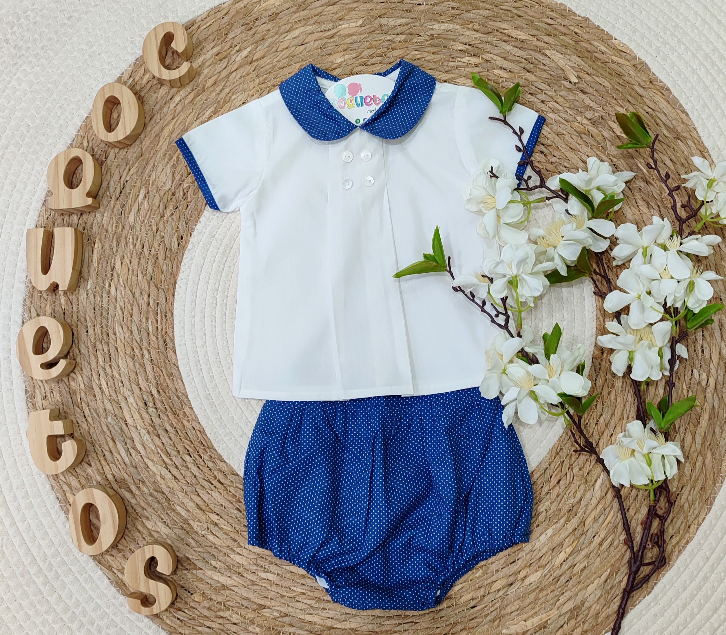 - La camisa, de manga corta en blanco puro, destaca por su doble fila de botones decorativos en el pecho y su cuello bebé con detalles en azul marino con mini lunares blancos.