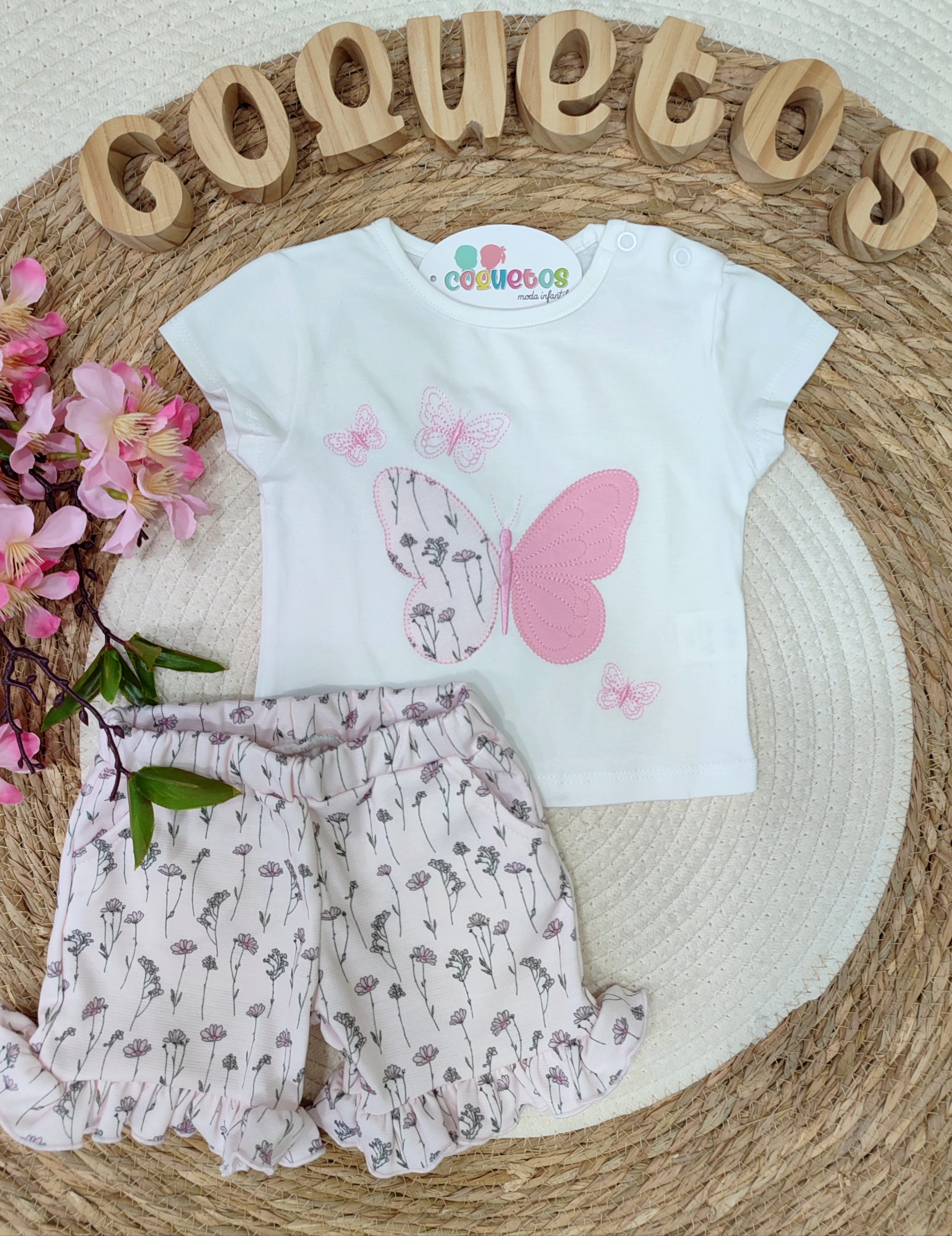 - La camiseta blanca 100% algodón luce una delicada mariposa rosa de gran tamaño decorada con pequeñas flores silvestres, combinada con otras mariposas bordadas en tonos pastel.