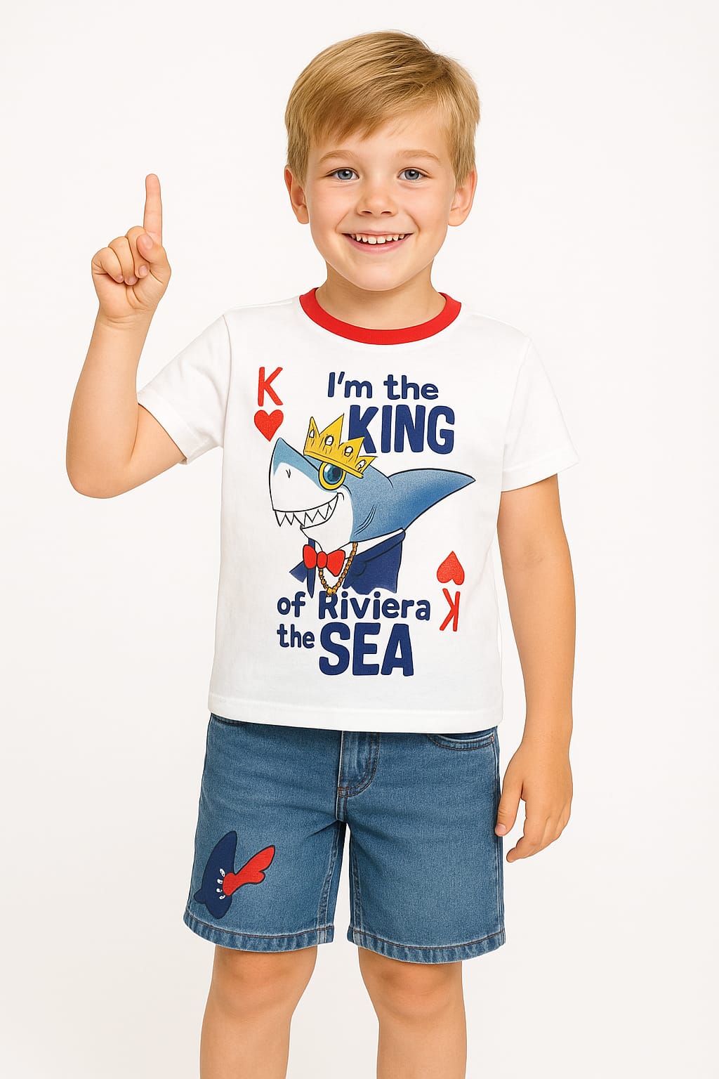 La camiseta blanca de algodón luce un divertido tiburón con corona y pajarita, acompañado del mensaje “I’m the King of the Riviera Sea”, en un diseño colorido y llamativo que encantará a los niños.