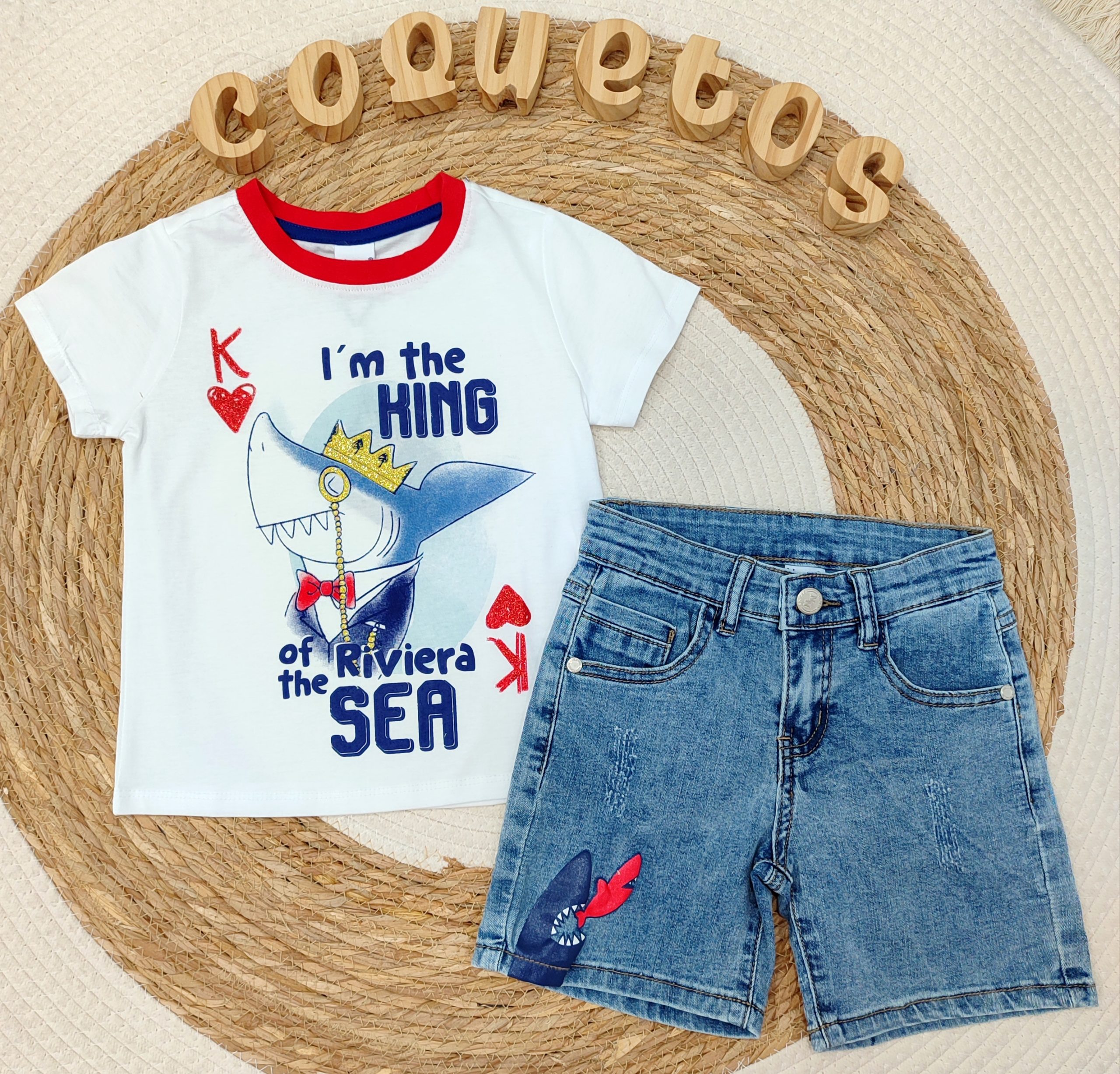 El conjunto se completa con un pantalón corto vaquero de mezclilla suave y elástico, con bolsillos funcionales y detalle bordado del mismo tiburón, lo que aporta unidad y carácter al look.