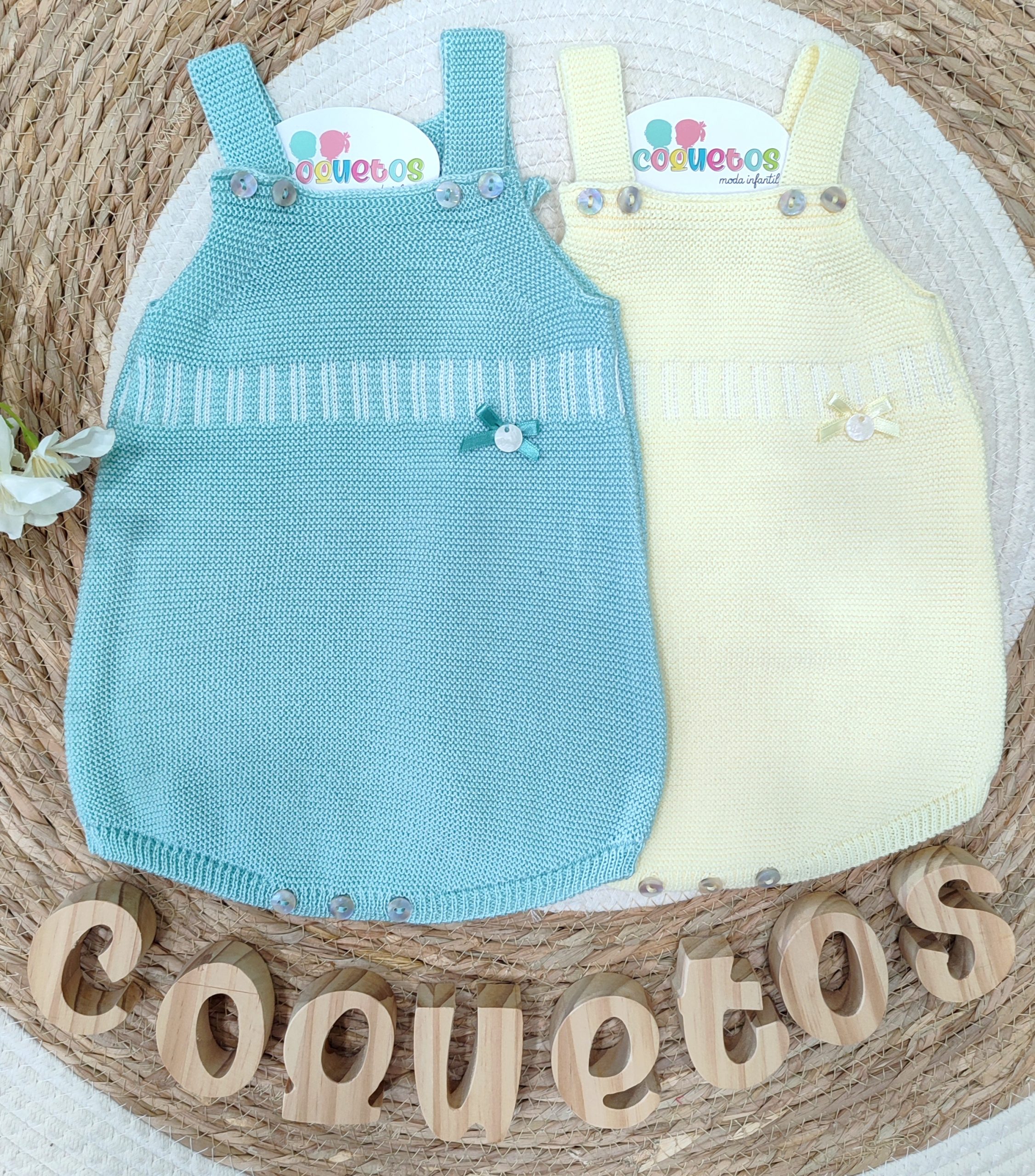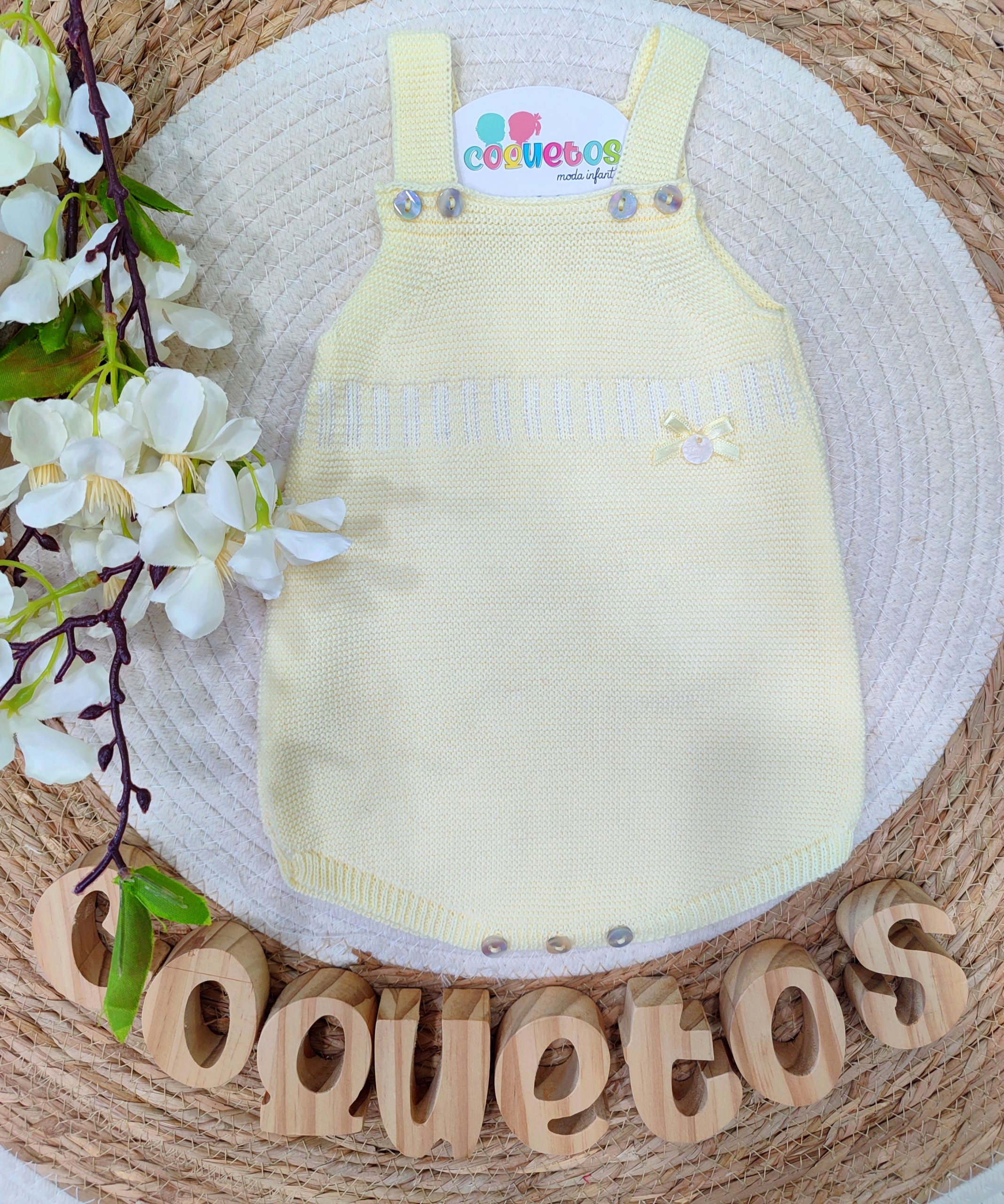 - Con un diseño clásico y delicado, cuenta con tirantes ajustables mediante botones nacarados y tres cómodos botones en la parte inferior para facilitar el cambio de pañal.