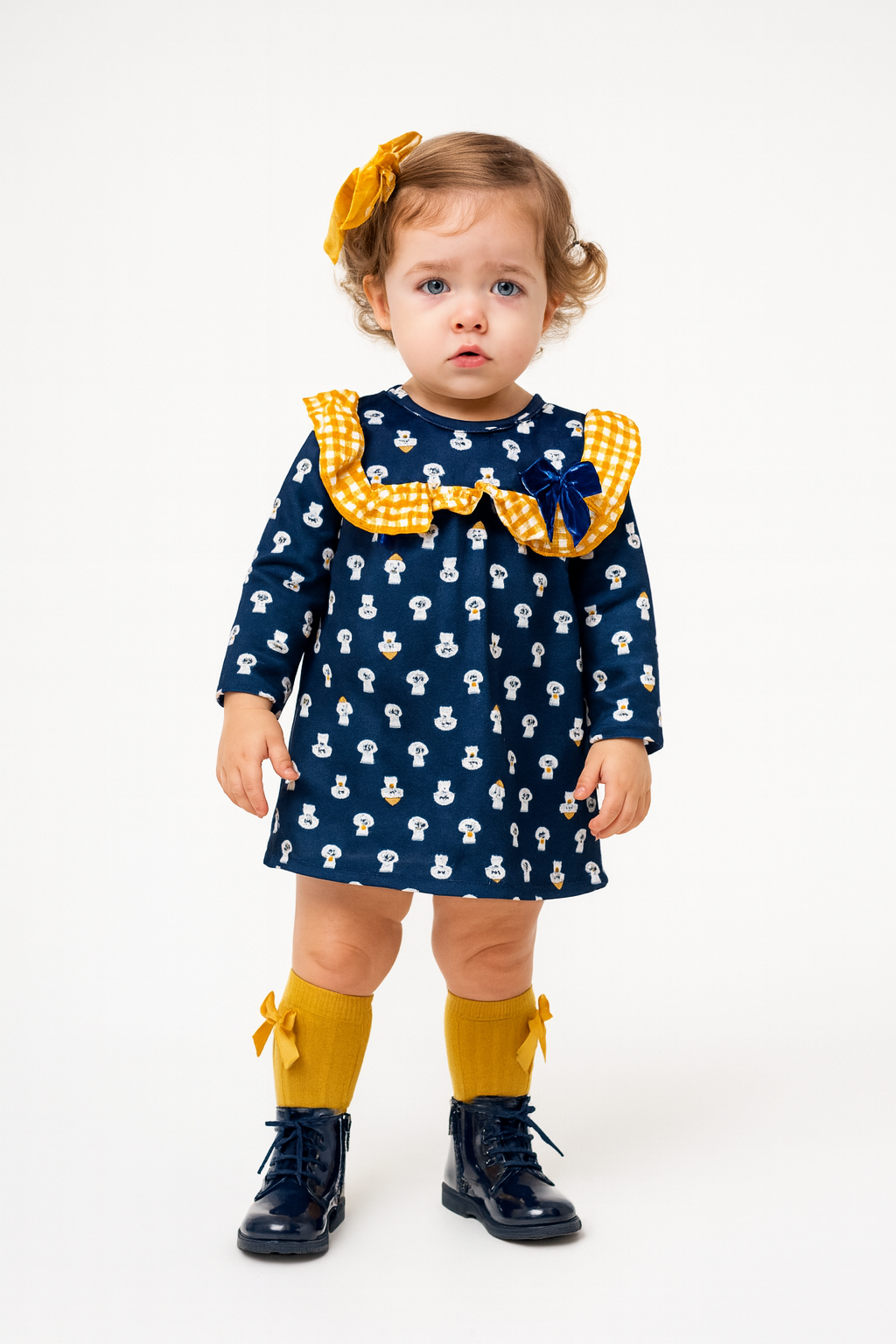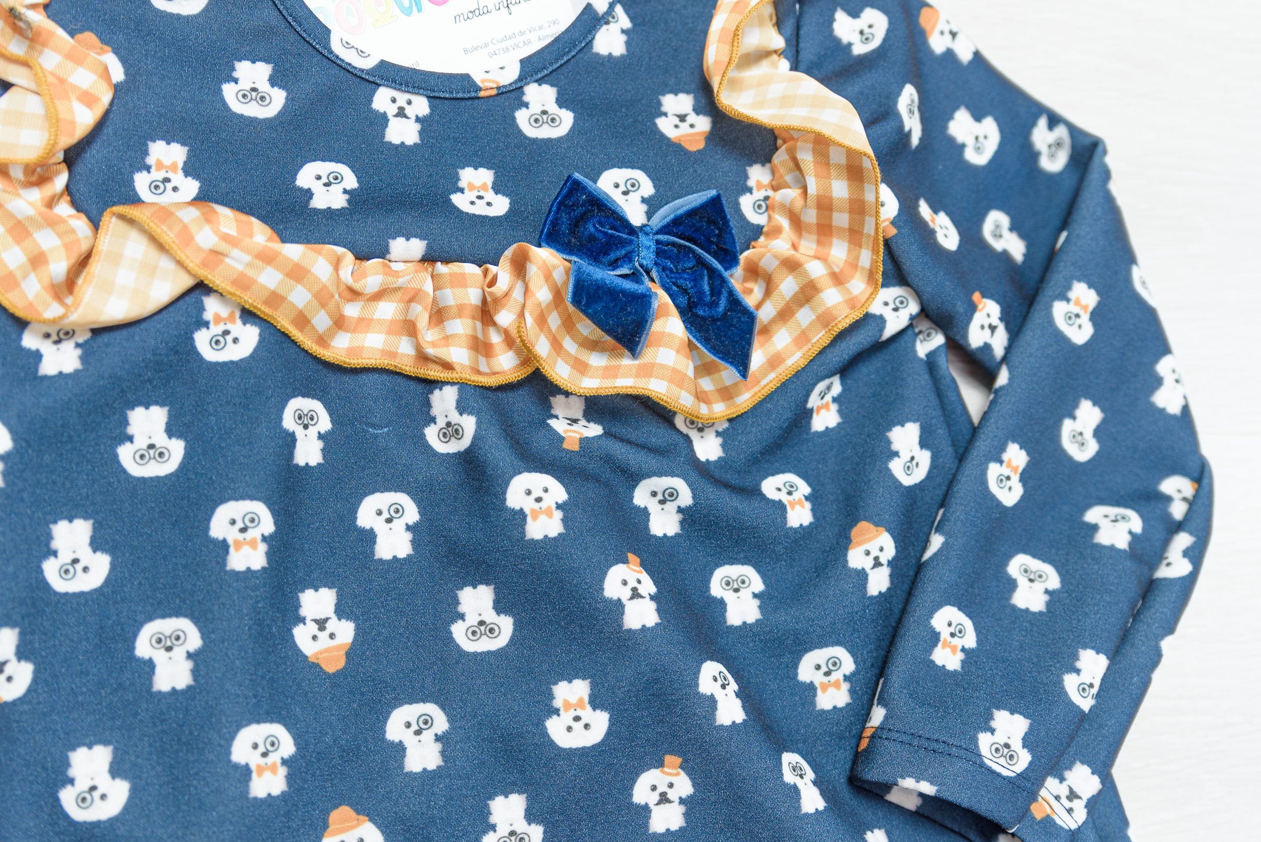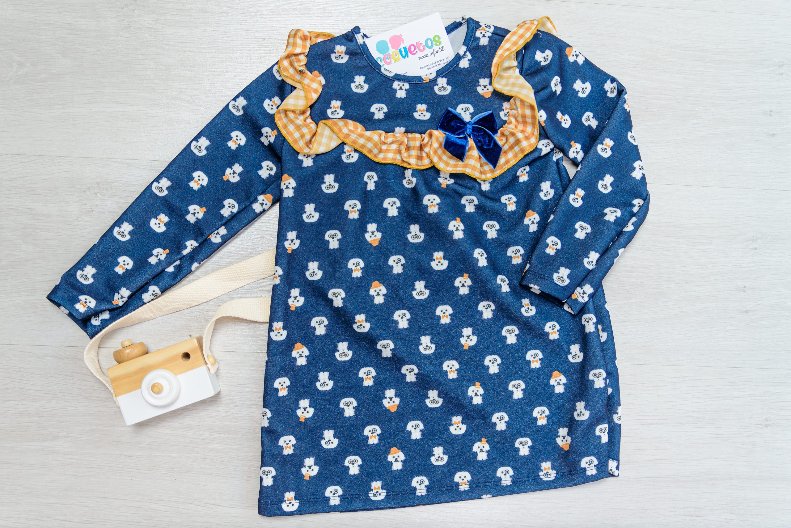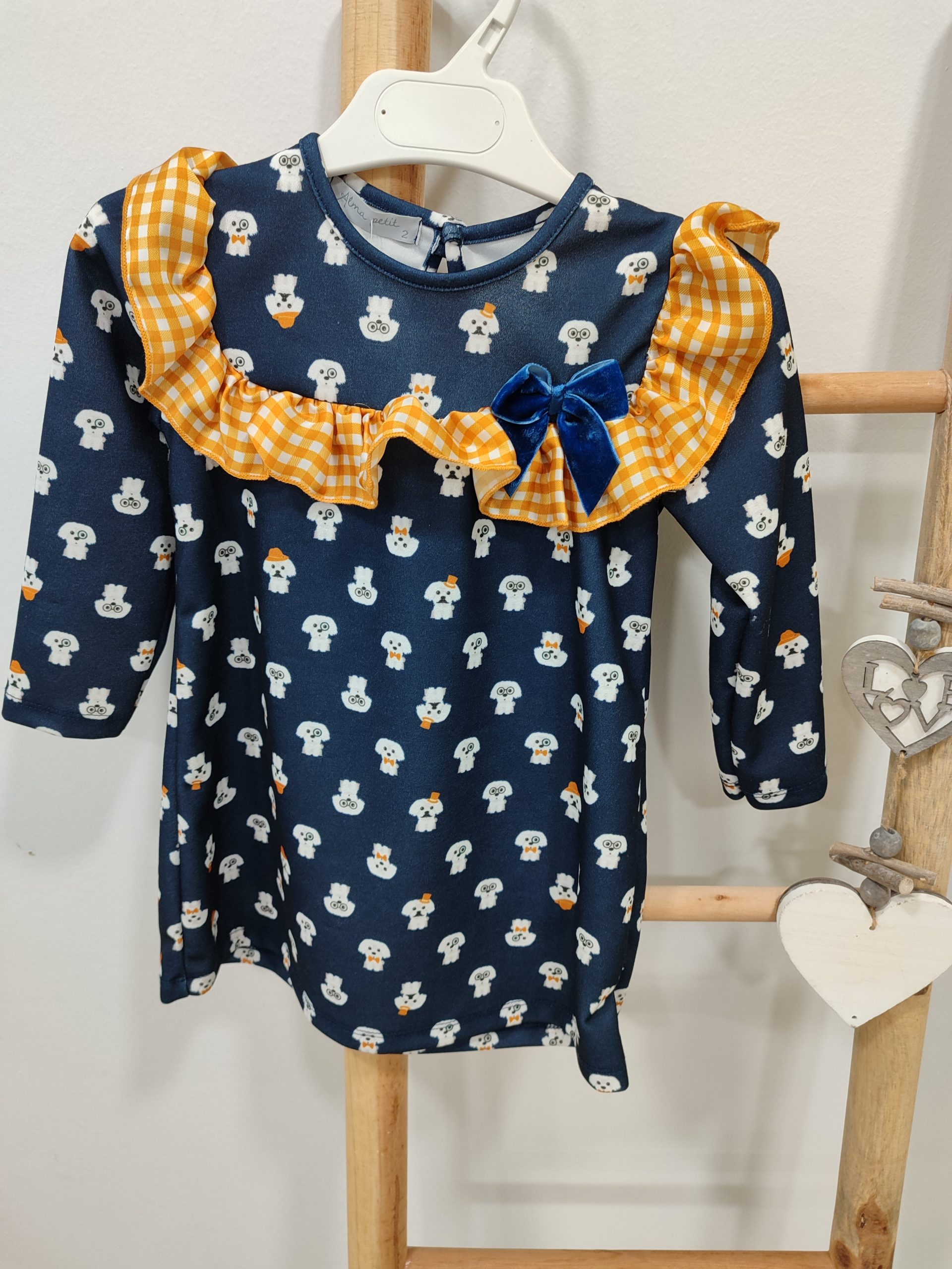 • Vestido de manga larga en azul marino con estampado de perritos simpáticos, con volante de cuadros mostaza y lazo de terciopelo.